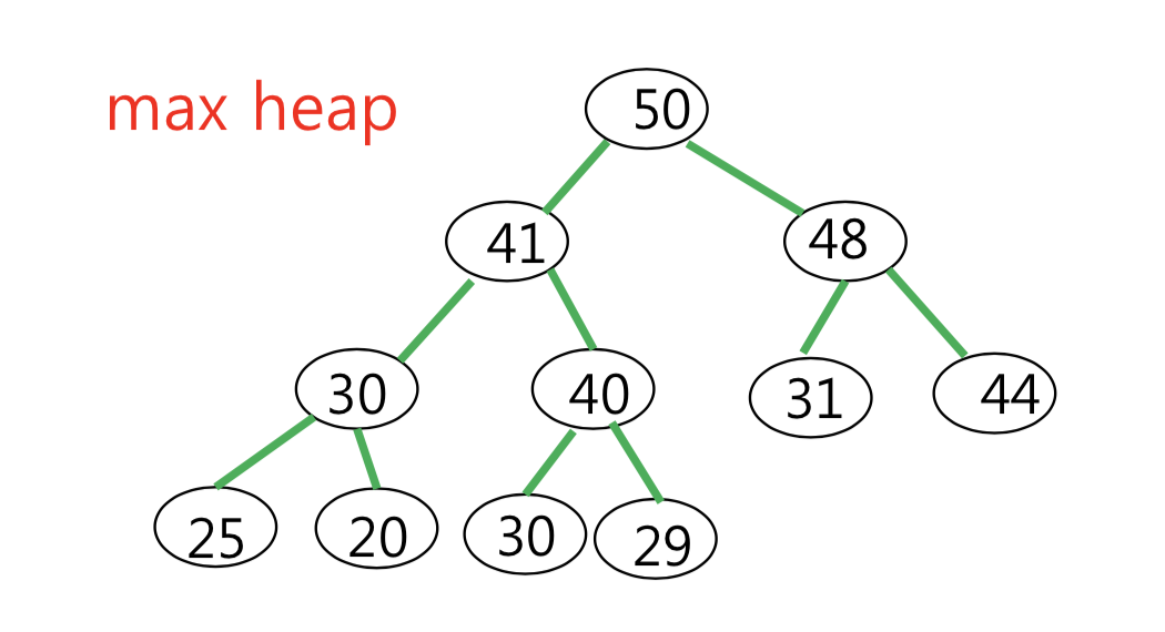 예를 들어서 생각해보자! 새로운 원소가 30이라면, 바로 저 자리에 넣으면 된다. 그러나 값이 49이면 넣을 수 없다. 그러므로 31을 검은색 위치에 넣고, 최대 힙이 되는지 본다. 여전히 안 된다. 그럼 48을 그 자리에 넣는다. 여전히 안된다. 51을 그 자리에 넣는다. 이제야 된다!