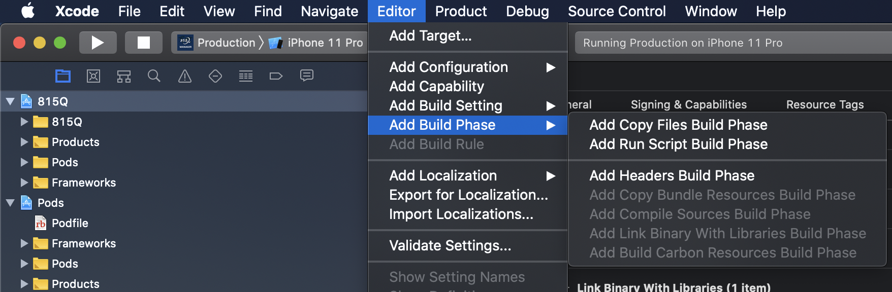 Editor > Add Build Phase > Add Run Script Build Phase 를 누른다.