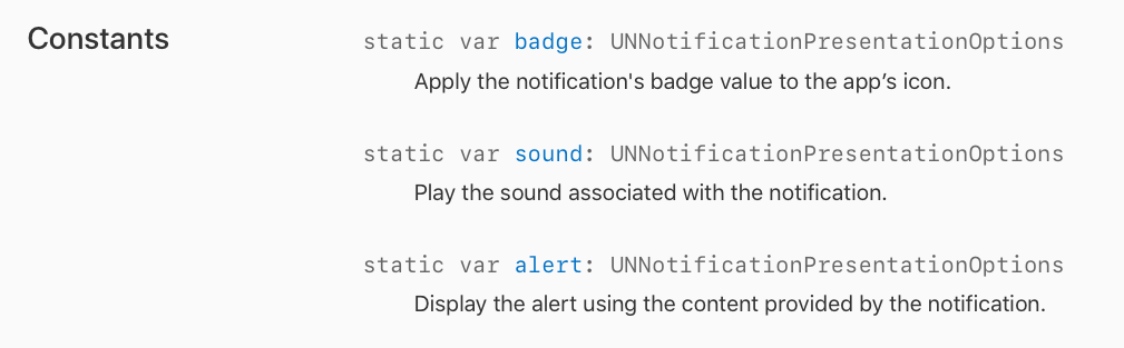 만약 이 델리게이트를 구현 안해뒀으면, 시스템은 UNNotificationPresentationOptionNone 으로 설정해둔 것 처럼 구현될 것이다. 아예 유저노티피케이션 센터에 델리게이트도 전달해주지 않았으면, 시스템은 notification의 오리지널 옵션으로 유저한테 알람을 줄 것이다.