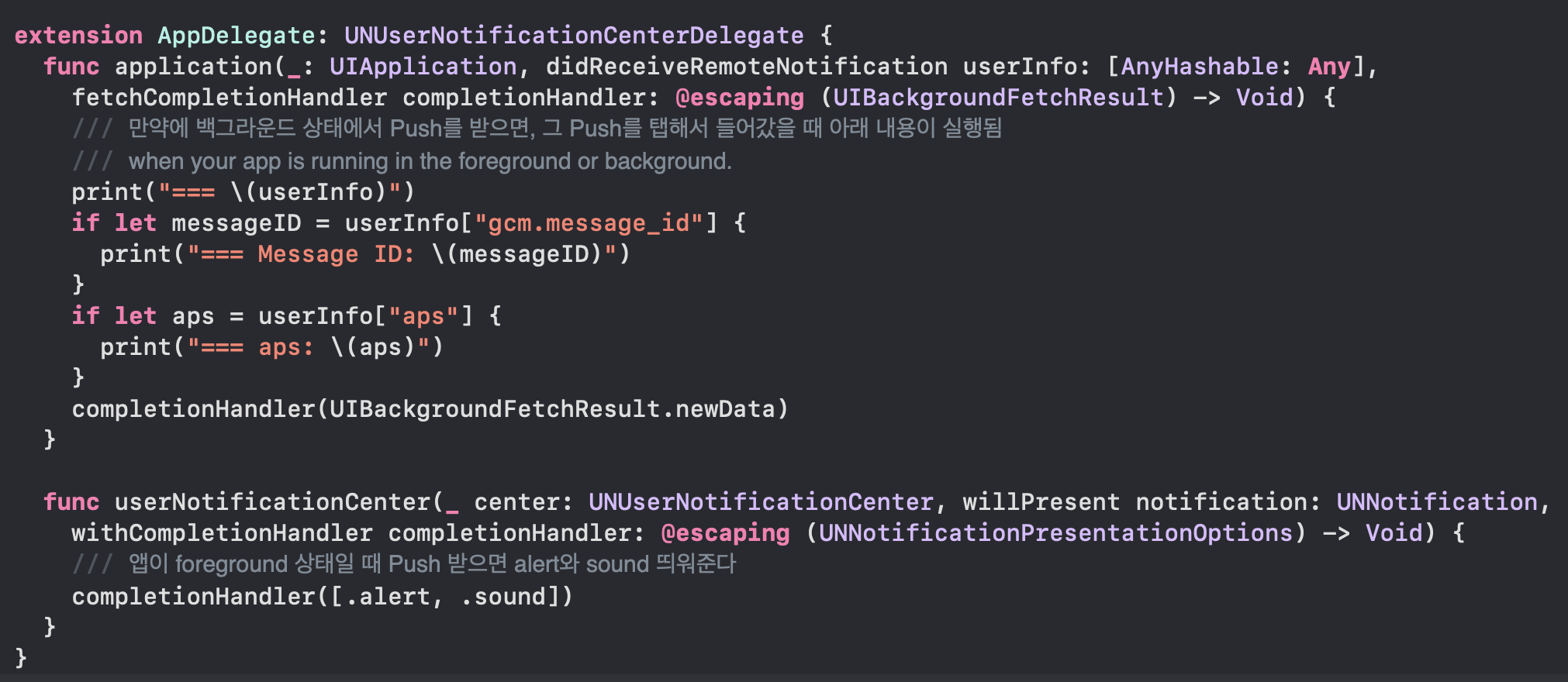 [iOS] UNUserNotificationCenterDelegate의 두가지 didReceiveRemoteNotification 함수