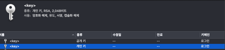 - 키체인 앱은 자동으로 공개키와 개인키를 생성한다. 이 키는 키체인 앱의 Key 카테고리에서 확인할 수 있다.