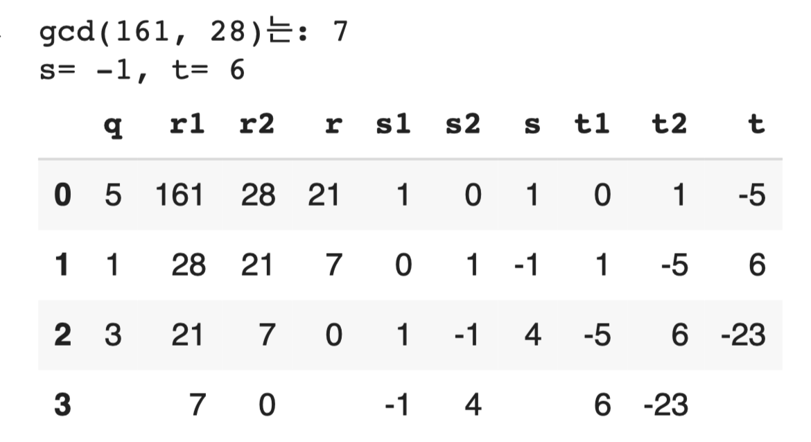 가끔 gcd를 구하다 보면, s x a + t x b = gcd(a, b)를 만족하는 s랑 t를 구해야할 때가 있다. extended euclidean algorithm을 쓰면 gcd 값과 s,t 를 동시에 구할 수 있다.