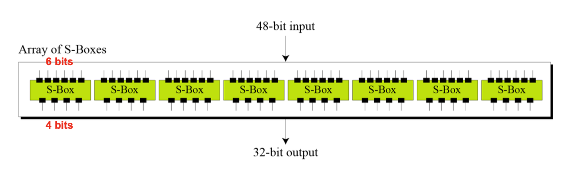 F함수 내부를 자세히 보면, Expansion P-box, XOR, S-Boxes, Straight P-box 이렇게 4개의 과정으로 구성되어 있다.
