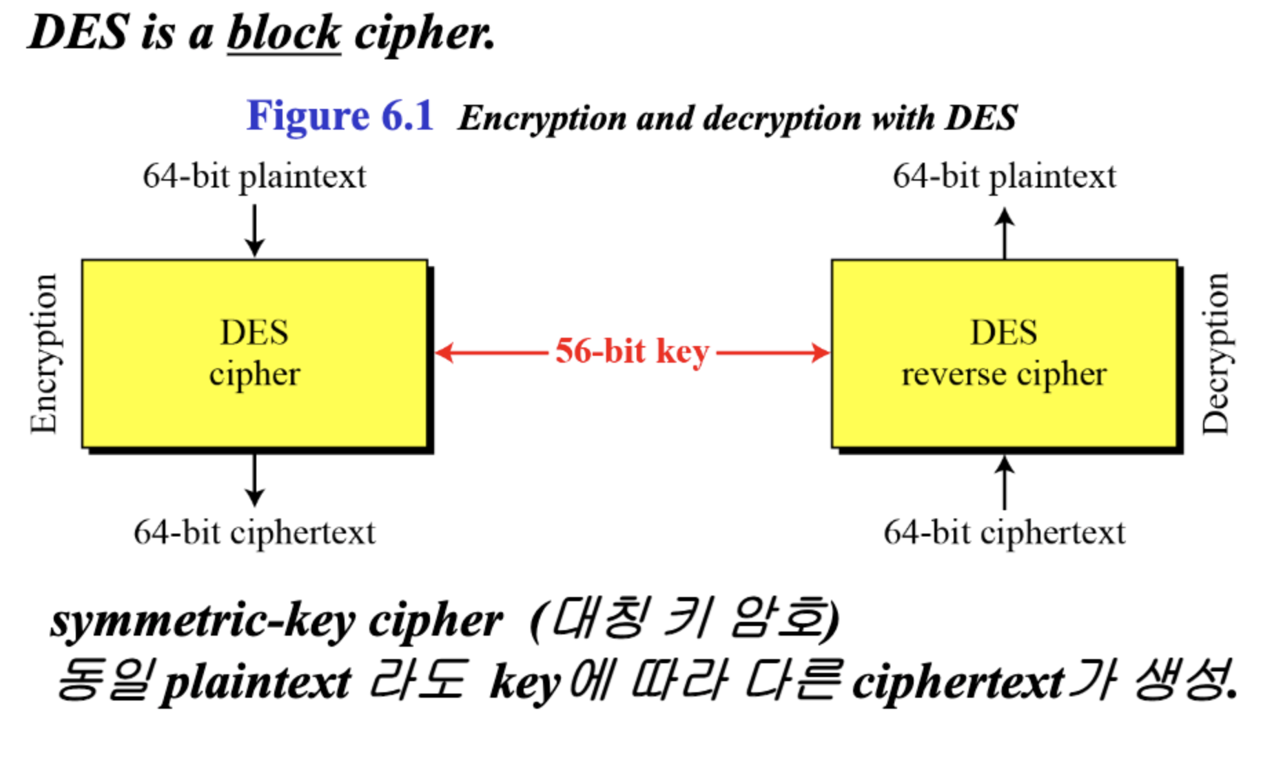 DES는 64비트의 평문을 가지고 64비트의 암호문을 생성한다. 이때 동일한 56비트의 암호키(cipher key)가 암호화, 복호화 과정에 모두 사용된다.