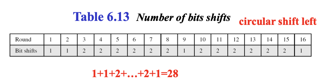 Round마다 shift할 bit의 수가 다르다. 1, 2, 9, 16 round에서는 1비트만, 나머지 라운드에서는 2bit를 left shift 해주면 된다.