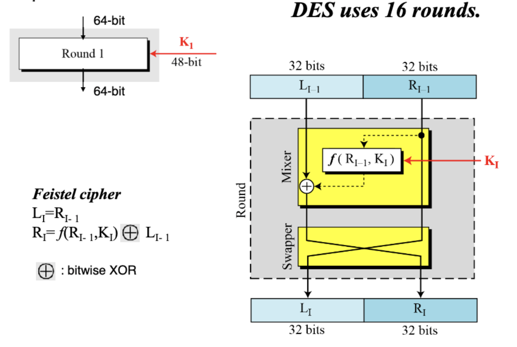 오른쪽 그림의 과정을 16번 반복하게 된다. 64-bit의 input을 32bit씩 잘라서, 오른쪽 파트는 그대로 왼쪽으로 가고 왼쪽 파트는 F함수를 거쳐서 오른쪽으로 붙는다. 이 F함수(Mixer)가 DES의 핵심이다.