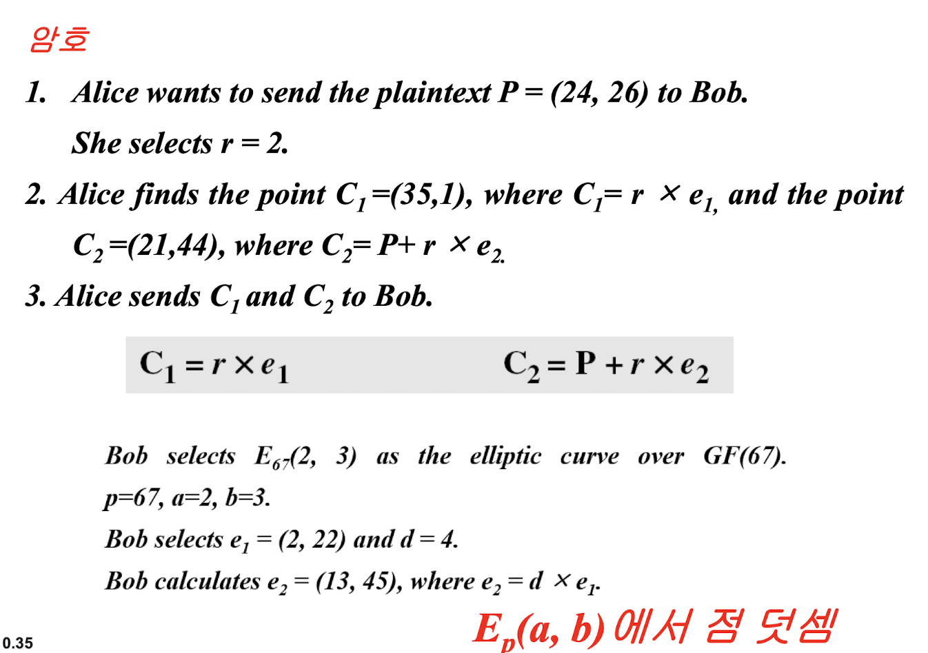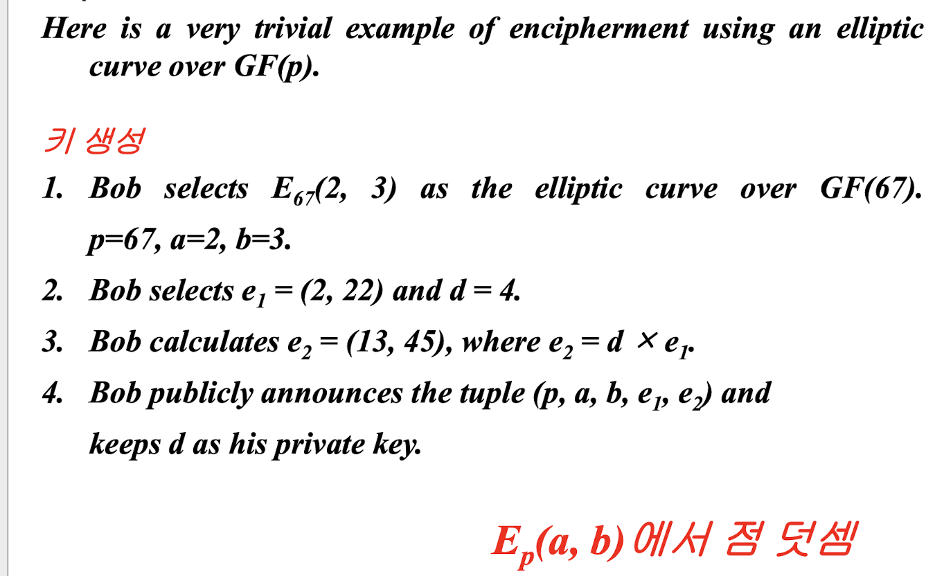 Ep(a,b)에 포함된 P(PlainText)를 고른다. 이게 plainText임. (텍스트를 점으로 변환하는 방법에 대해서는 다루지 않는다.)