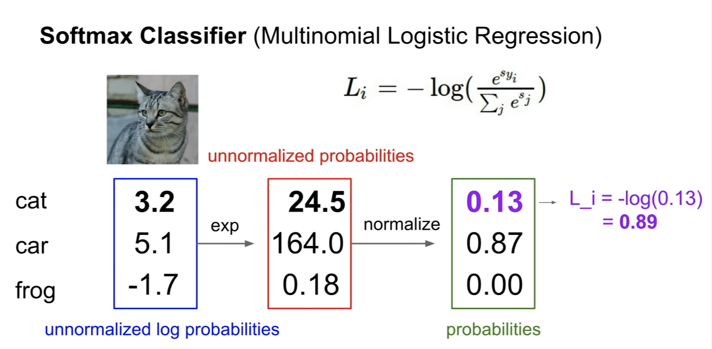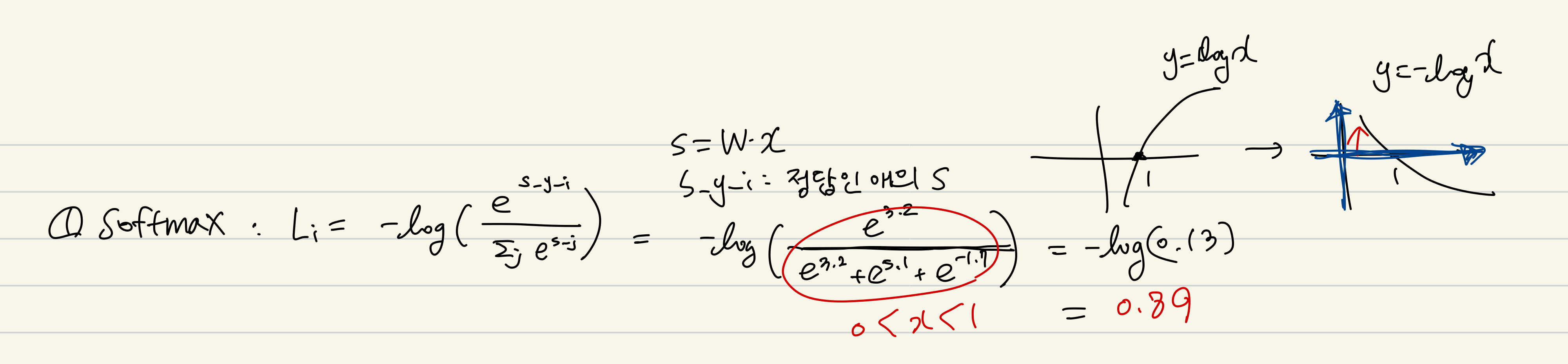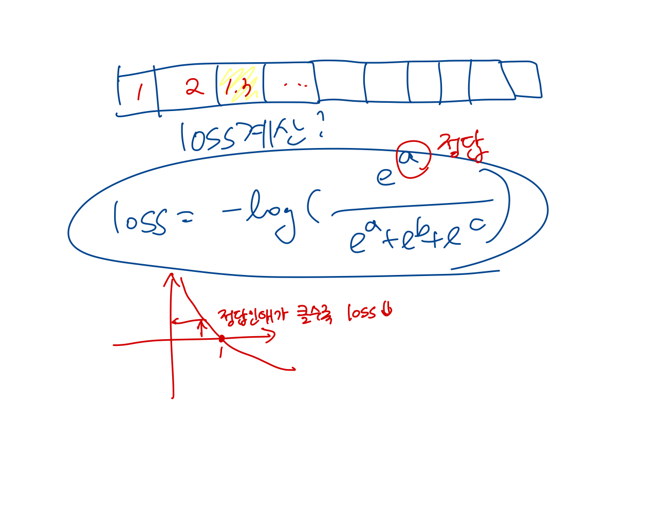 그래프 상에서도 정답인 애의 값이 크면, loss가 작아지는 모습을 볼 수 있다. 만약 정답인 애만 값이 있고 나머지는 다 0으로 예측했다면 loss는 -log(1), 0이다.