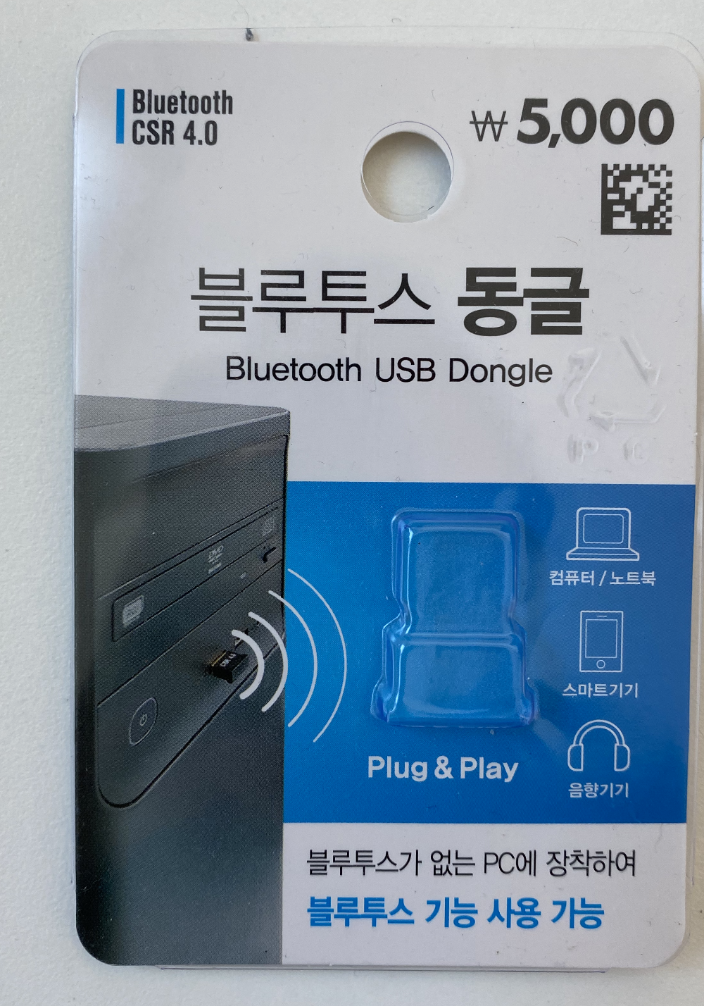 데스크탑에 블루투스 기능이 없어서 다이소에 가서 5000원 주고 블루투스 동글을 사 왔다.
